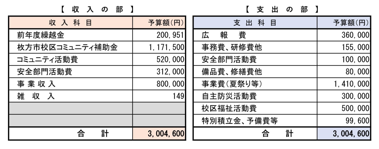 ・支出としては、夏祭りをはじめ四季を楽しむ行事などに141万円、広報紙やインターネットなどの広報費に36万円、校区福祉委員会には枚方市からの補助金より50万円を、自主防災会には同補助金20万円に10万円をプラスして30万円を支出します。