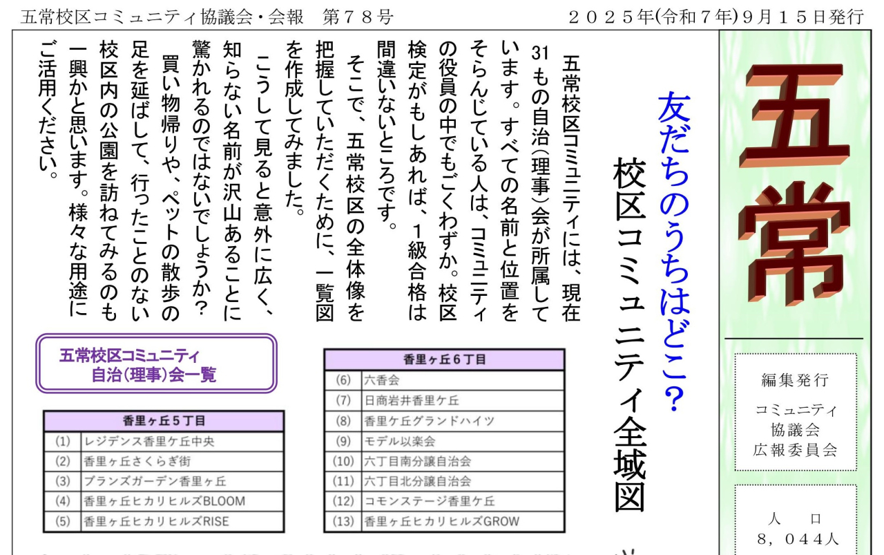 ・コミュニティ全域図・ごじょっこマーケット・夏季防犯パトロール・四中花火フェスタ・百済寺跡の松風・スマイルが咲かせる花々・借り放題、読み放題・【告知】 五常祭り/煙突山見学会・【告知】 第17回 五常文化祭
